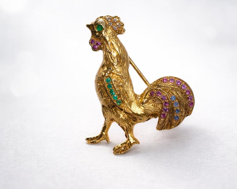 Crafted in gold, this piece was designed by Aaron Kalati alongside his son, Rami, in 1989 — a moment frozen in metal that captured not only their technical mastery, but their shared vision. Set with vibrant gemstones and sculpted with unmistakable character, the rooster was never meant to be practical, nor commercial. It was an exercise in creativity, confidence, and belief in craftsmanship for its own sake.